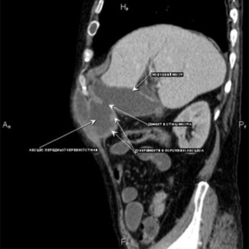 Встановлено діагноз гострого деструктивного холециститу з пенетрацією дна жовчного міхура в передню черевну стінку, утворенням фістули та розвитком субапоневротичного міжм’язового абсцесу з анаеробним компонентом. Окрім того, у хворого виявлено холедохолітіаз і механічну жовтяницю (білірубін - 98 ммоль/л).